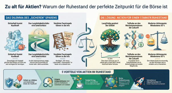 Wir sparen auf Sparbüchern, während andere Nationen über Aktien und Fonds Wohlstand aufbauen. Genau deshalb ist es umso wichtiger, im Alter nicht auf Aktien zu verzichten – denn ohne Beteiligung an den globalen Kapitalmärkten bleibt die eigene Altersvorsorge anfällig für Inflation, Demografie und die politische Rentendebatte.